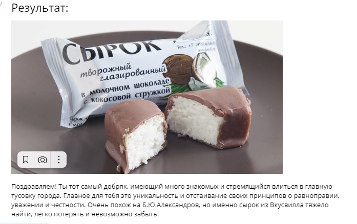 Поздравляем! Ты тот самый добряк, имеющий много знакомых и стремящийся влиться в главную тусовку города. Главное для тебя это уникальность и отстаивание своих принципов о равноправии, уважении и честности. Очень похож на Б.Ю.Александров, но именно сырок из Вкусвилла тяжело найти, легко потерять и невозможно забыть.